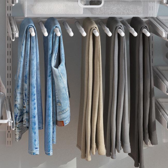 Брючница оснащена трубой диаметром 16 мм, рассчитанной на 6 пар брюк, и легко устанавливается между двумя вертикальными стойками на кронштейны глубиной 435 мм — без использования инструментов.